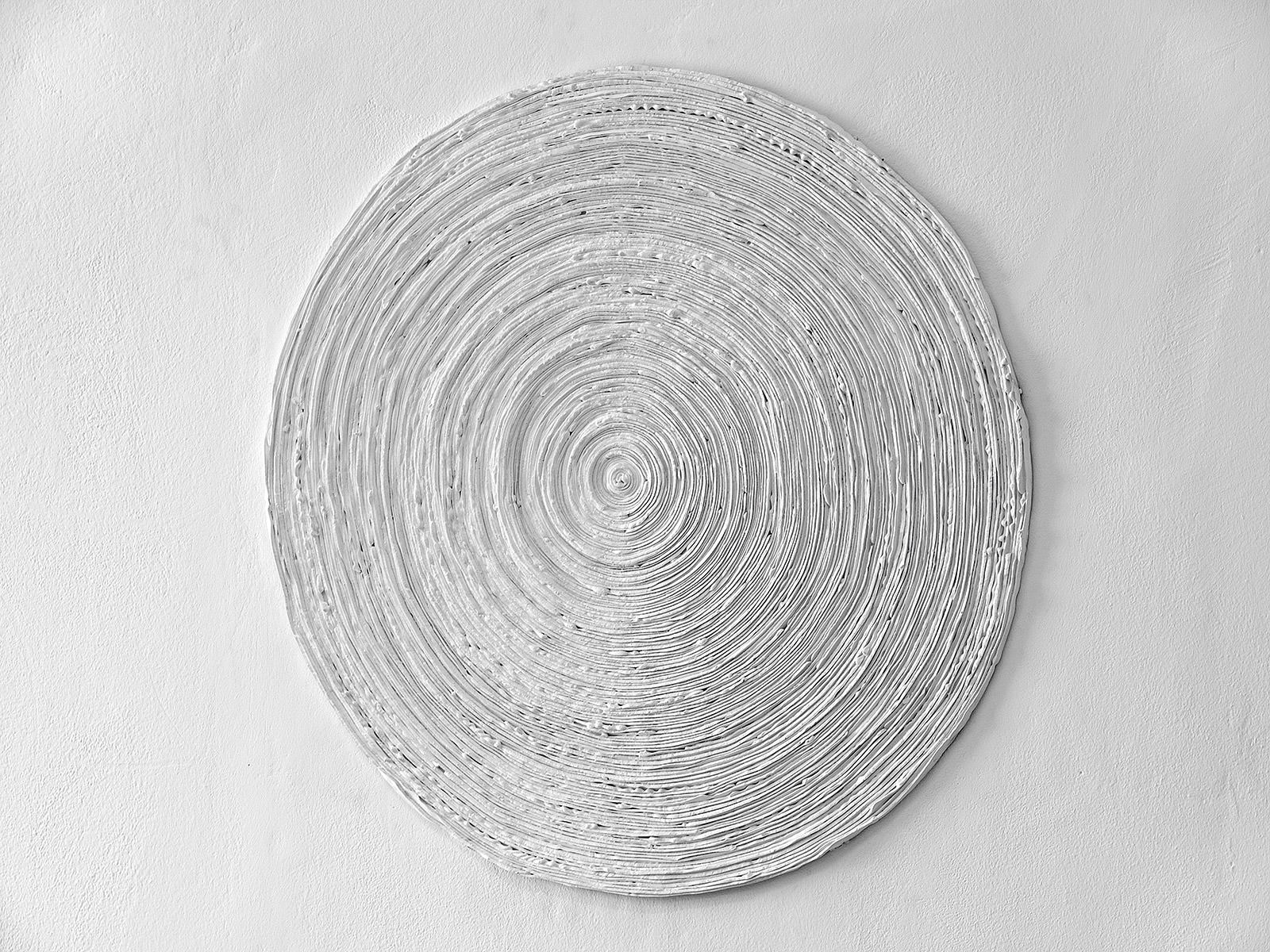Barbara Höller nimmt die pure Farbe - in Variationen - auf, formt daraus Farbschnüre und rollt diese zu Spiralen. Hier sehen Sie auf Glas aufgebrachte Farblinien aus Acrylfarbe - wenn Acryl pur aufgetragen wird, entsteht aus der dickflüssigen Farbe im Lauf des Trocknungsprozesses ein mittelfestes, elastisches, leicht verformbares Material - wenn sie im richtigen Moment, den Kairos des Trocknungsprozesses der Farbschnüre ergreift und daraus Spiralen rollt, nämlich genau zu dem Zeitpunkt, wenn die Schnüre nicht mehr zu weich sind, um sie in die Hand zu nehmen, und doch noch nicht so hart, um zu unnachgiebig oder brüchig zu sein. Zu Spiralen gewunden trocknet die Farbe dann weiter, die einzelnen gebogenen Linien haften aneinander und werden durch den Härtungsprozess zu einer festen Scheibe, die dann nicht mehr verformbar ist.