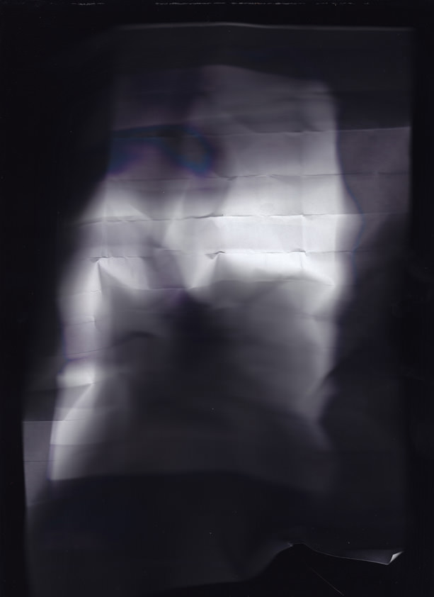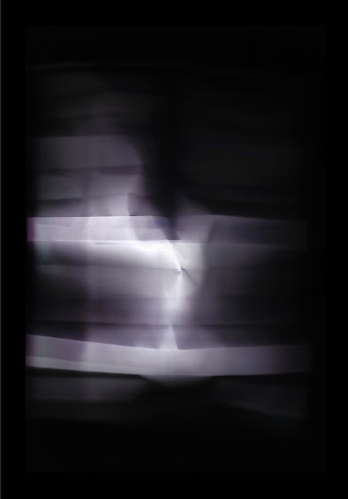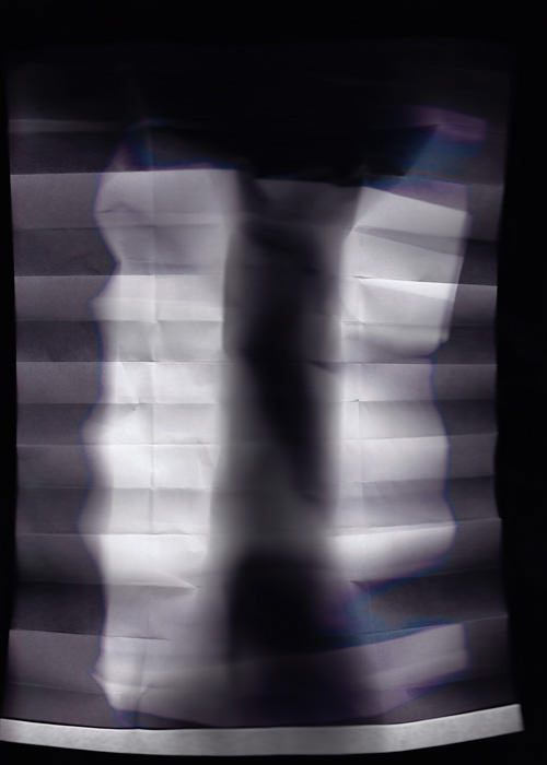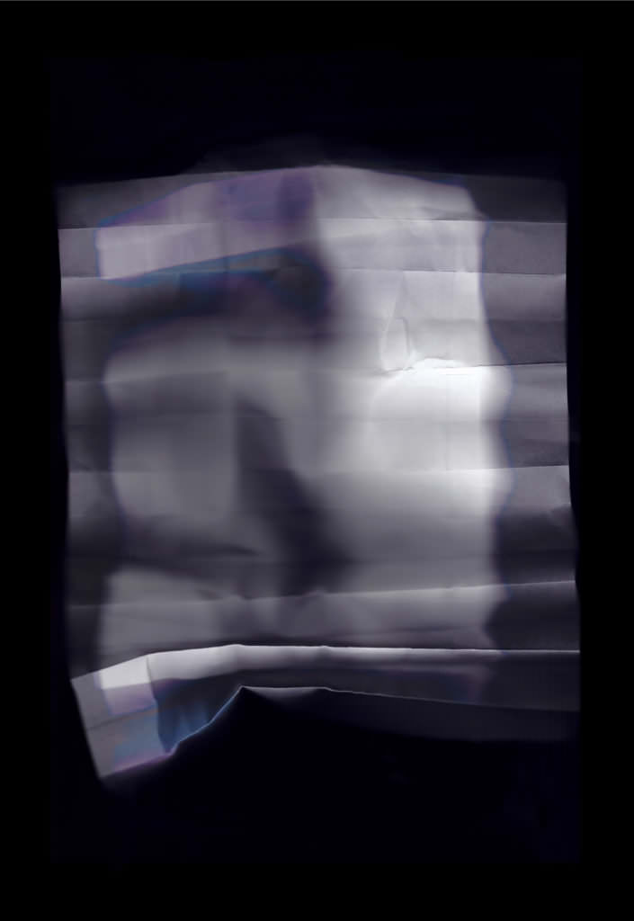 Ein Blatt Papier wird mehrmals gefaltet und eingescannt. Das Ergebnis wird ausgedruckt und dieser Ausdruck wird wiederum gefaltet und eingescannt. Dieser Vorgang wiederholt sich ein paar Mal. Raum wird zu Fläche, Fläche zum Raum. Digitales wird analog und umgekehrt. Kommunikation mit der Technik.